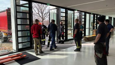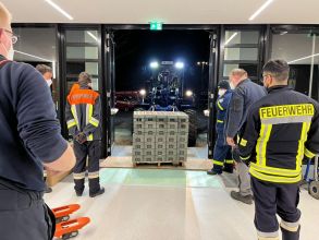 Kurz nach Freitagmittag ging es dann los: Die ersten Bodenschutzmatten wurden ausgelegt sowie die ersten Garnituren wurden vorerst in den Windfang abgeladen. Dadurch, dass aber einiges an Material benötigt wurde, wurden nach vielen Telefonaten zwischen der Stadt Bamberg gemeinsam dem Stadtbrandinspektor Ewald Pfänder und verschiedensten Firmen die Fahrzeuge der Bamberger Wehr erneut entsendet, um weitere Güter zu beschaffen.