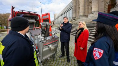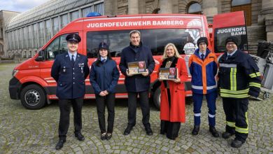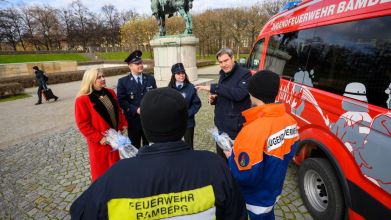 Seit nun etwas mehr als drei Jahren steht das Ausbildungsfahrzeug der Jugendfeuerwehr Bamberg „Florian Bamberg 11/11/1“, so der Funkrufname, im Dienst. Aufgrund der strengen Hygienevorschriften während der Coronapandemie konnten die Jugendlichen selten mit dem Fahrzeug üben, noch die Unterstützer das Fahrzeug betrachten. Nun wollten der Bayerische Ministerpräsident Dr. Markus Söder und die Staatsministerin Melanie Huml, welche das Projekt unterstützten und mittels Videobotschaft befürworteten, persönlich begutachten und ihren Dank aussprechen. Daher wurden Stadt-Jugendfeuerwehrwart Alexander Wilhelm und dessen Stellvertreter Alexander Ohme, welche federführend das Projekt betrieben, zusammen mit den beiden Jugendsprechern Elisabeth Kießling und Finn Plaha in die Bayerische Staatskanzlei nach München eingeladen.