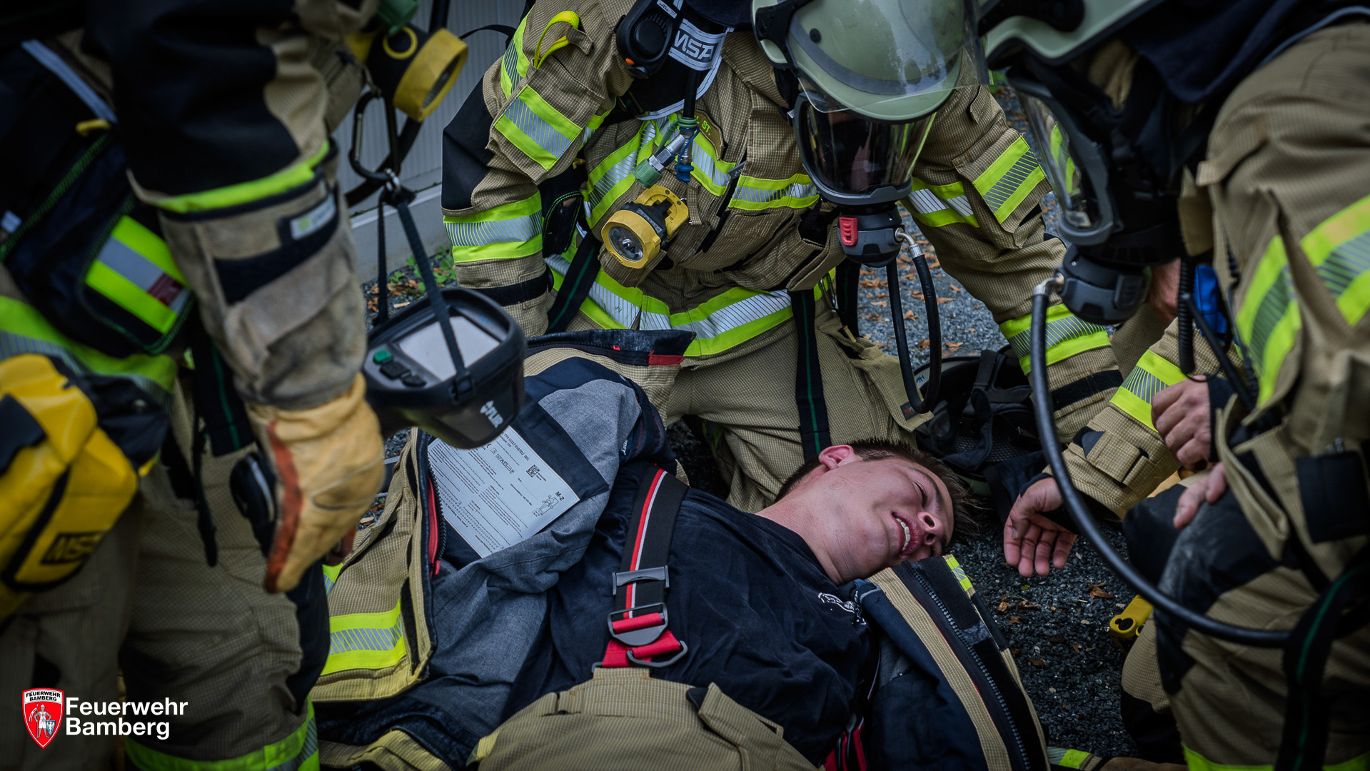 Nachdem die Wasserversorgung sichergestellt war, ging ein Atemschutztrupp mit Strahlrohr zur Brandbekämpfung in den Container vor. Besondere Aufmerksamkeit erforderte dabei ein Atemschutznotfall. In diesem Fall meldete sich die betroffene Einsatzkraft mit dem Funkruf „Mayday-Mayday-Mayday“ und löste damit das standardisierte Rettungsverfahren aus. Der bereitstehende Sicherheitstrupp griff sofort ein, lokalisierte den verunglückten Atemschutzgeräteträger, versorgte ihn mit Atemluft und brachte ihn aus der Gefahrenzone. Während der Rettung wurde der Feuerwehr-Einsatzleiter fortlaufend über Lage und Zustand des Kameraden informiert. Die Situation konnte geordnet und erfolgreich abgearbeitet werden und verdeutlichte eindrucksvoll, wie wichtig trainierte Abläufe im Ernstfall sind.