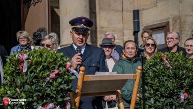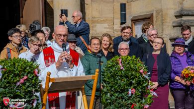 Anschließend sprachen Bürgermeister Glüsenkamp, Stadtbrandrat Florian Kaiser und Amtsleiter Christian Seitz zu den Anwesenden. Sie würdigten das Engagement der Einsatzkräfte und die Bedeutung der neuen Fahrzeuge für die Sicherheit in Bamberg und über die Stadtgrenzen hinaus. Den Abschluss bildeten weitere Segensworte des Pfarrers, der allen Einsatzkräften Schutz und Erfolg für ihre zukünftigen Aufgaben wünschte. Auch Johannes Schuberth, Kommandant der Freiwilligen Feuerwehr Buttenheim, der Patenwehr von Bamberg, griff kurzerhand zum Mikrofon und beglückwünschte die Einsatzkräfte in Bamberg.