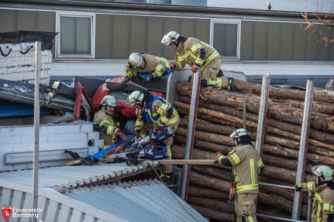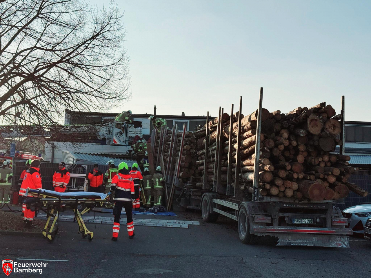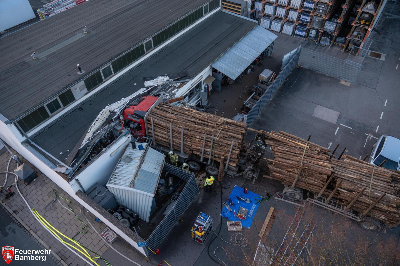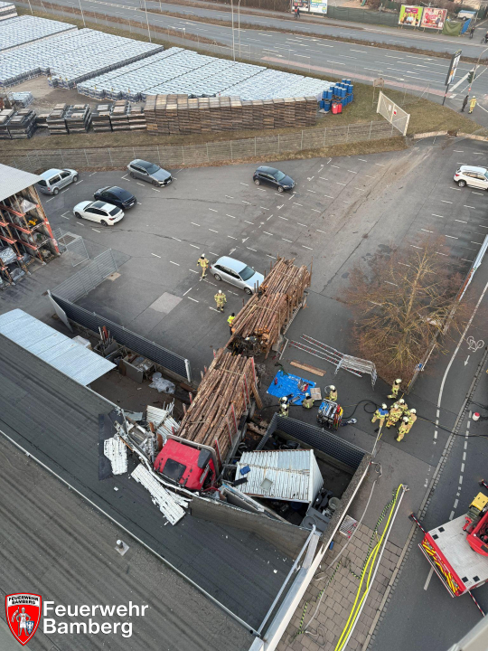 Am Nachmittag wurde die Feuerwehr Bamberg initial zu einer ausgelösten Brandmeldeanlage zu einem Industriegebäude in der Geisfelder Straße alarmiert. Da bereits zügig durch die Leitstelle zurückgemeldet wurde, dass wohl ein LKW in ein Gebäude gefahren sein soll, wurde eine Lageänderung zu THL - Verkehrsunfall LKW mit eingeklemmter Person durchgeführt.