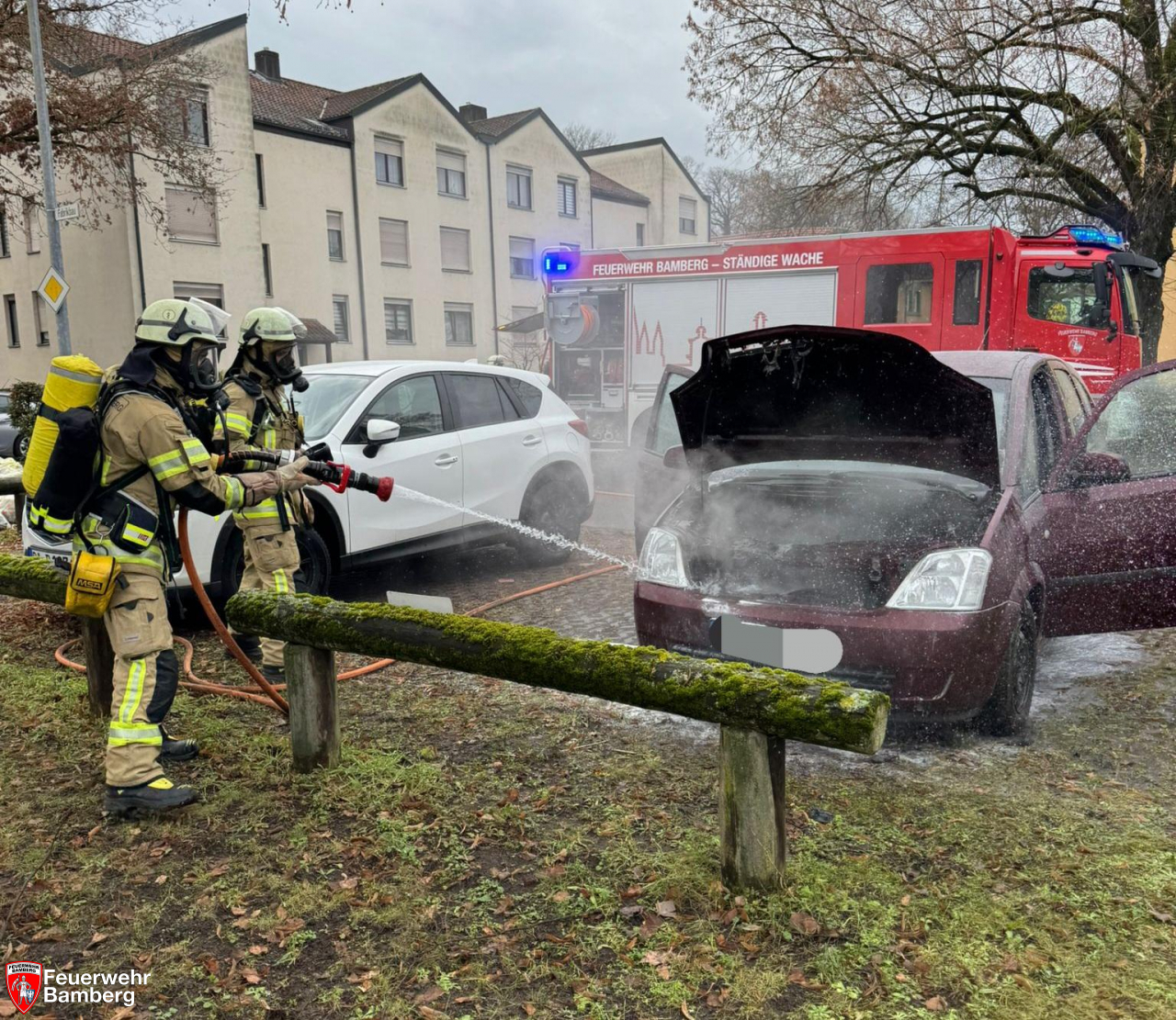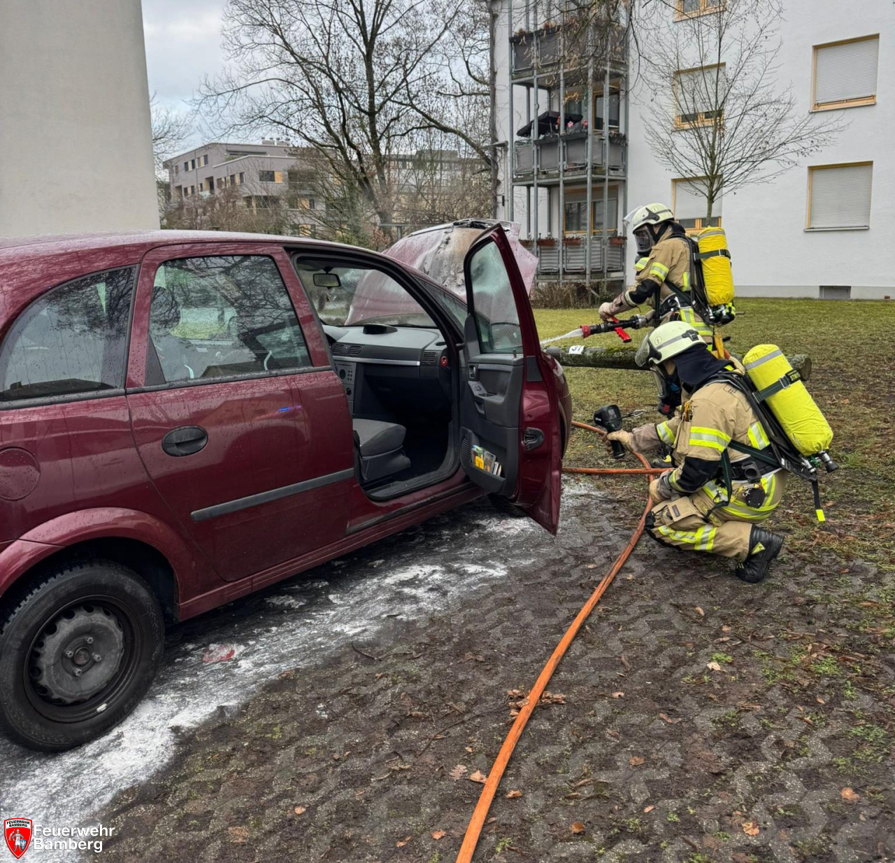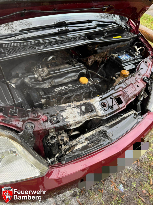 Passanten hatten wertvolle Vorarbeit geleistet, indem sie mit tragbaren Feuerlöschern die Flammen eindämmten. Die Einsatzkräfte löschten unter Zuhilfenahme eines Hohlstrahlrohres unter Atemschutz den Brand im Motorraum des Pkw vollständig ab.