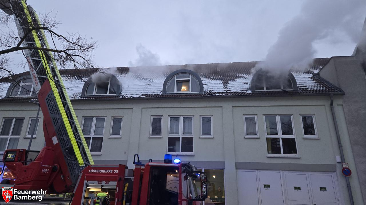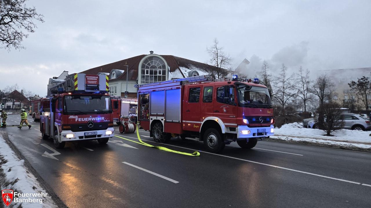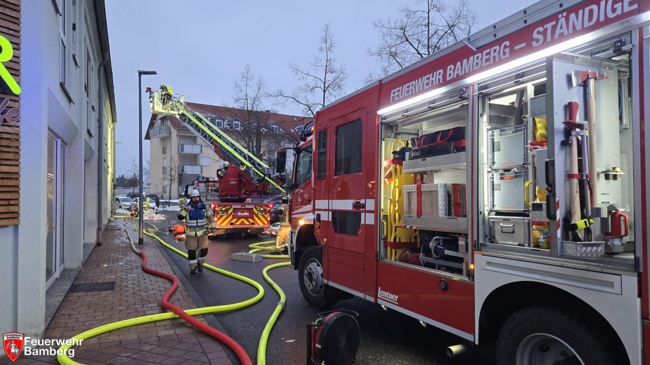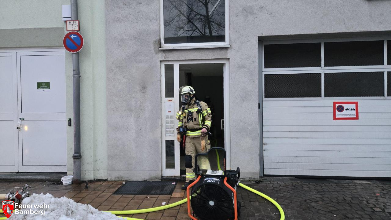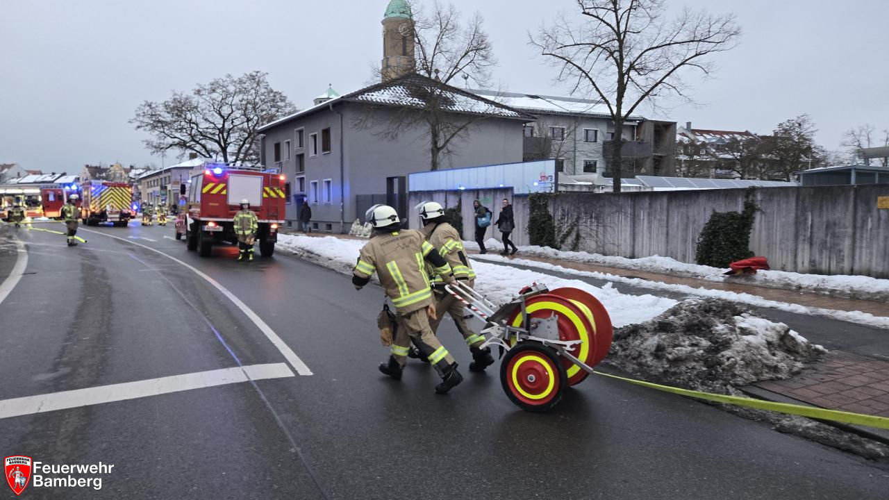 Am Nachmittag wurde die Feuerwehr Bamberg zu einem Zimmerbrand in der Magazinstraße alarmiert. Passanten meldeten oberhalb eines Supermarktes schwarzen Rauch aus einem Fenster. Diese Meldung bestätigte sich bei Eintreffen der ersten Kräfte nach wenigen Minuten. Da zudem Personen an den Fenstern standen und nicht flüchten konnten, wurde die Alarmstufe auf "B3 mit Personen in Gefahr" erhöht.