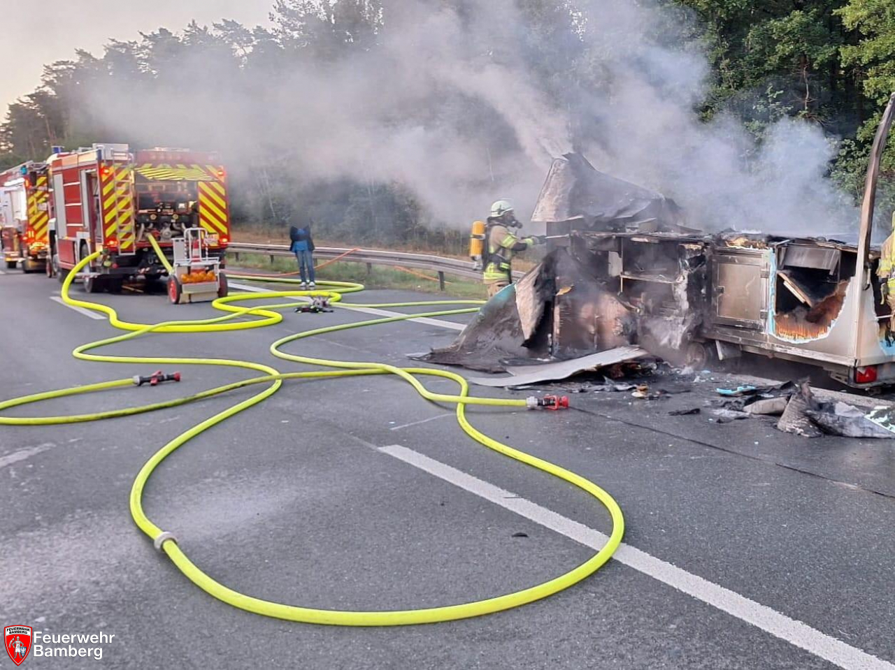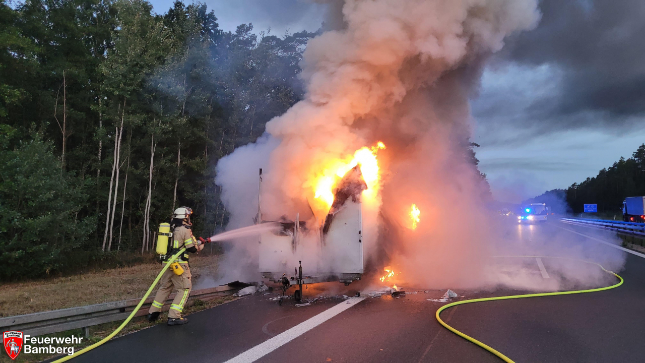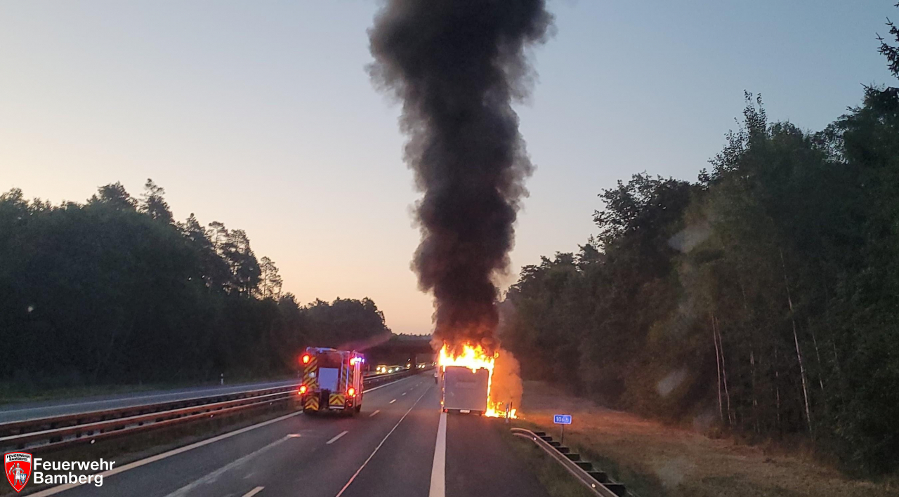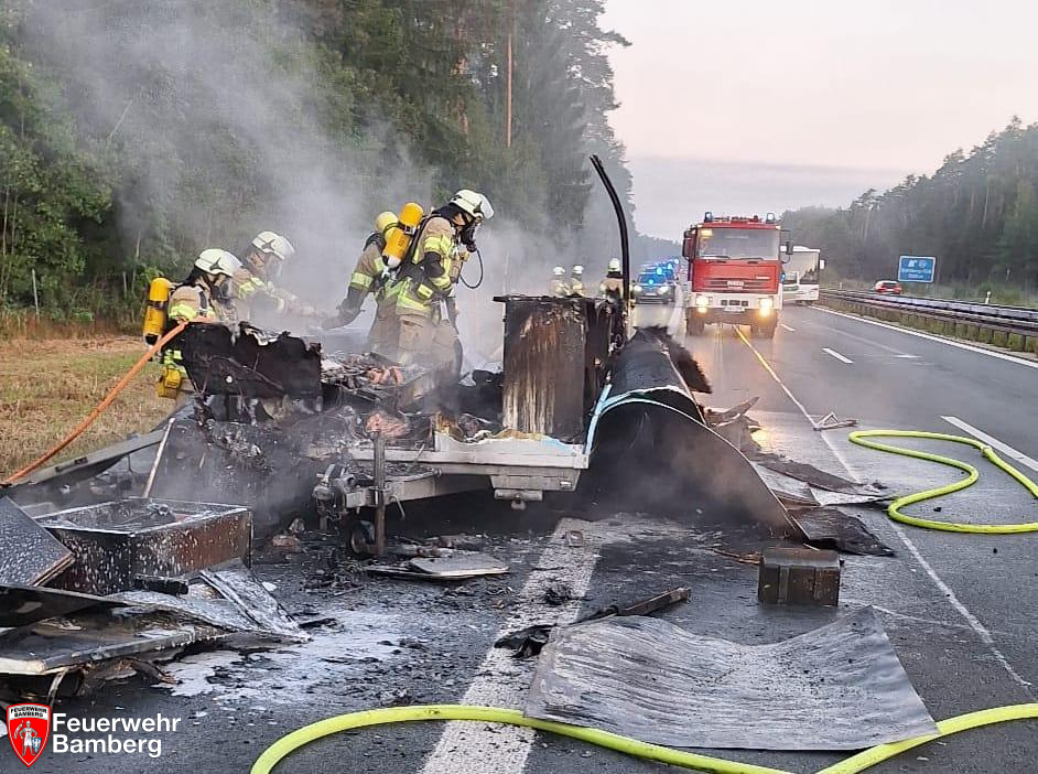 In den Morgenstunden wurde die Feuerwehr Bamberg zu einem Fahrzeugbrand auf die A73 alarmiert. Zwischen den Anschlussstellen Bamberg Süd und Hirschaid geriet ein Grillwagenanhänger in Brand. Geistesgegenwärtig kuppelte der Fahrzeuglenker das Gespann ab.