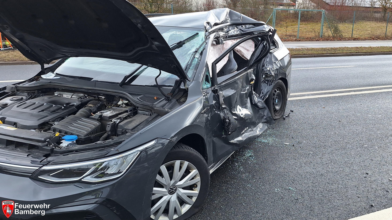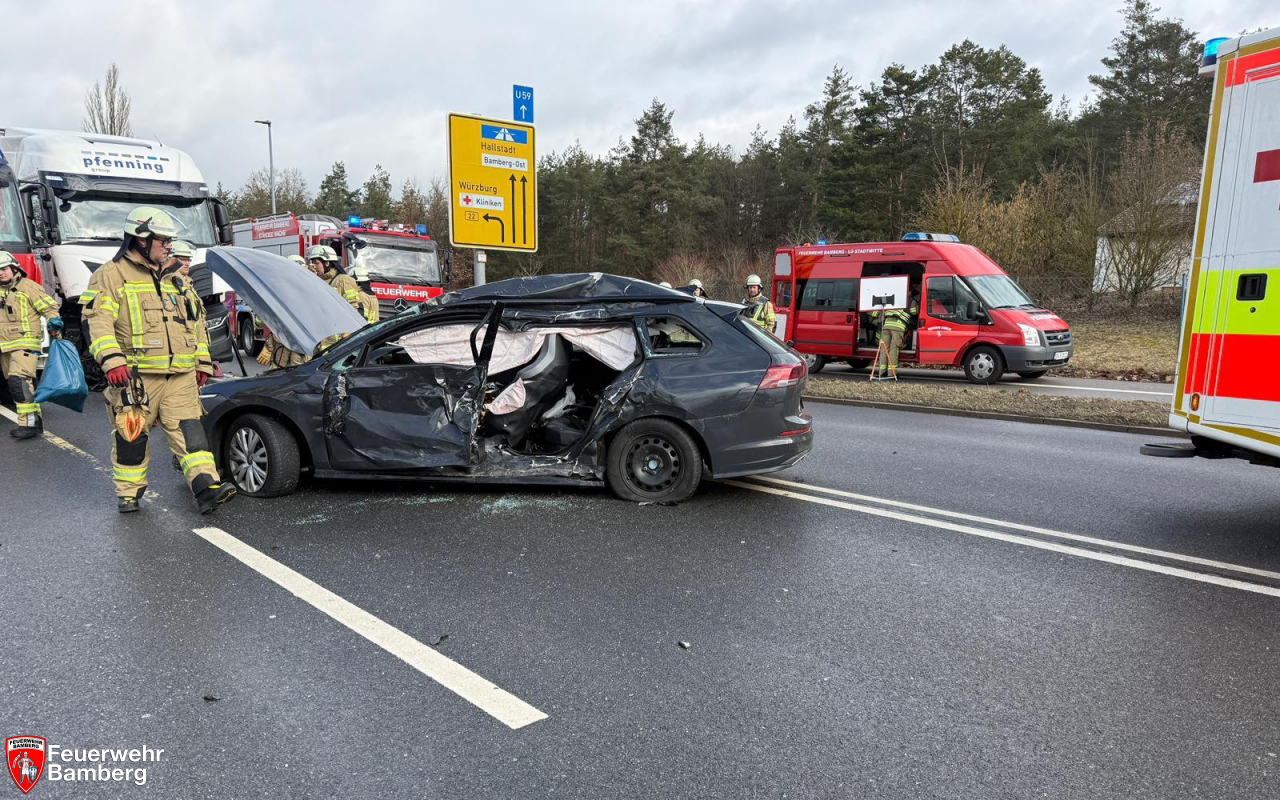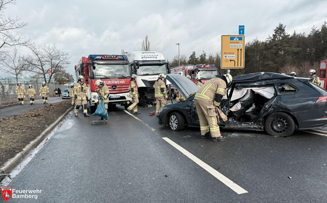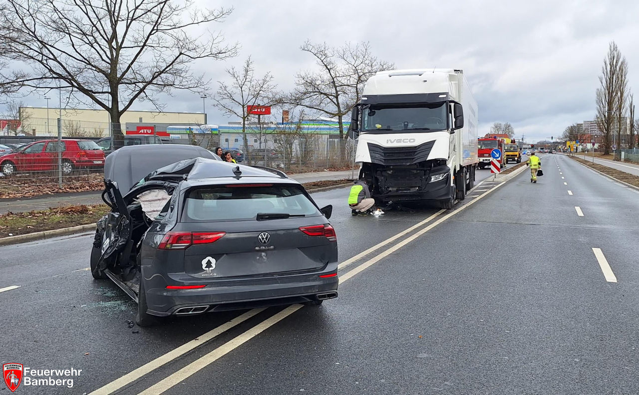 Am Samstag Vormittag wurde die Feuerwehr Bamberg zu einem Verkehrsunfall mit eingeklemmten Personen auf den Berliner Ring alarmiert. Zwischen Münchner Ring und Gutenbergstraße kam es zum Zusammenstoß zwischen einem Pkw und einem Lkw. Hierbei wurde der Pkw-Lenker schwer verletzt und in seinem Fahrzeug eingeklemmt.