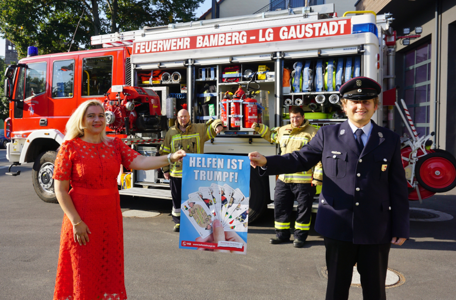 Kurz nach Eröffnung der bayernweiten Feuerwehr-Aktionswochen, welche dieses Jahr den Titel "Helfen ist Trumpf!" tragen, besuchte Melanie Huml (Staatsministerin für Gesundheit und Pflege) die Bamberger Wehr.