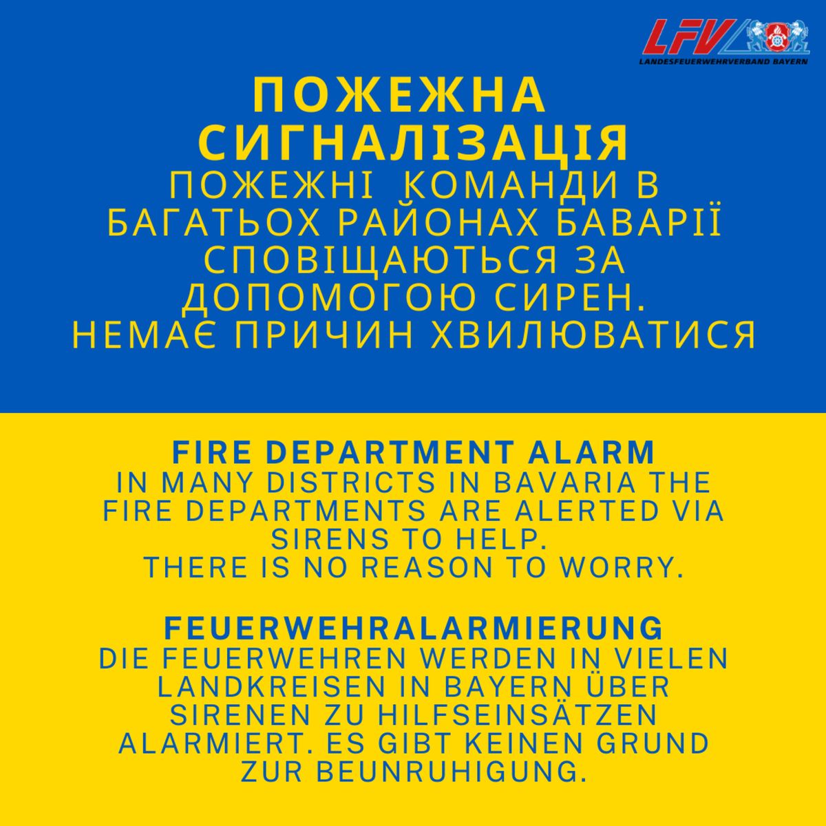 Um den Flüchtlingen die Angst vor Sirenen zu nehmen, welche im Landkreis oft noch als Alarmierungsmittel der Feuerwehren dienen, hat der Landesfeuerwehrverband Bayern e.V. einen Artikel zum Umgang mit diesen ausgegeben. Dieser soll die Flüchtenden über die Sirenenbedeutung in Deutschland bzw. Bayern informieren und ihnen etwas die Angst vor dem Heulen der Sirenen nehmen. Zu finden ist dieser auf der Webseite des LFV Bayern unter "Aktuelles". Sirenen werden zwar innerhalb des Stadtgebietes Bamberg nicht als Alarmierungsmittel der Feuerwehr Bamberg genutzt, aber dennoch ist es möglich, dass die Flüchtlinge in Unterkünfte im Landkreis Bamberg oder gar in Bayern untergebracht werden, wo eine solche Sirene ggf. in der Nähe aufgebaut ist und benutzt wird.
