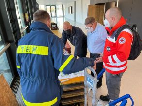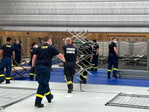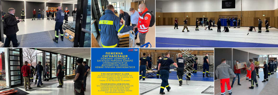 Zeitnah nach der Sitzung rollten also mit Koordinierungsunterstützung durch die Unterstützungsgruppe – Örtliche Einsatzleitung die ersten Feuerwehrfahrzeuge, um verschiedene Materialien einzusammeln. Auslegematten zum Schutz des Bodens in der Halle, Biertischgarnituren, Betten, Bauzäune mit Sichtschutzfolien mussten teilweise über Oberfrankens Grenzen hinaus besorgt werden. Auch das Technische Hilfswerk, das Bayerische Rote Kreuz sowie die Johanniter halfen mit, um diese große Aufgabe mit entsprechenden Fahrzeugen und Personal bewältigen zu können.
