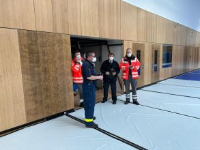 Die Kapazität der Unterkunft in der Ohmstraße war jedoch bereits erreicht. So entschied man sich die benachbarte Dreifachturnhalle der Graf-Stauffenberg-Schulen ebenfalls zu einer kurzfristigen Notunterkunft umzubauen.