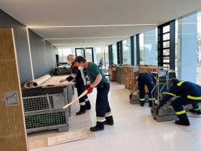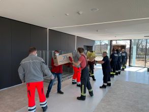 Kurz nach Freitagmittag ging es dann los: Die ersten Bodenschutzmatten wurden ausgelegt sowie die ersten Garnituren wurden vorerst in den Windfang abgeladen. Dadurch, dass aber einiges an Material benötigt wurde, wurden nach vielen Telefonaten zwischen der Stadt Bamberg gemeinsam dem Stadtbrandinspektor Ewald Pfänder und verschiedensten Firmen die Fahrzeuge der Bamberger Wehr erneut entsendet, um weitere Güter zu beschaffen.