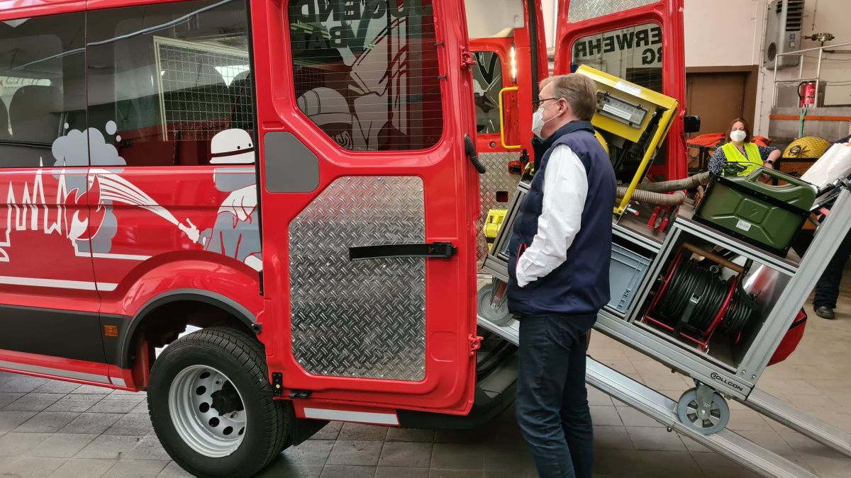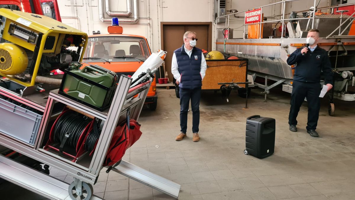 Erste Zwischenstation war die Gerätehalle in der Ludwigstraße, wo das Fahrzeug der Jugendgruppe „Florian Bamberg 11/11/1“, so der Funkrufname, präsentiert wurde und ausgiebig bewundert werden konnte. Dieses Fahrzeug wurde rein aus Spendenmitteln finanziert und somit das erste Fahrzeug Bayerns, das die Finanzierung rein aus Mitteln der Bevölkerung und Firmen bewerkstelligt hat. Durch das Projekt „Die Jugendfeuerwehr nimmt Fahrt auf“ konnte binnen 12 Monaten ein Spendenvolumen von gerundet 100.000 € erreicht und das speziell auf die Bedürfnisse der Jugendfeuerwehr ausgearbeitete Fahrzeugkonzept umgesetzt werden.
