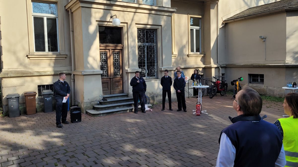 Dritte Station auf der Radeltour war die gemeinsame Gerätehalle der „Löschgruppe 2 / Jugendfeuerwehr“ in der Rotensteinstraße am Münchner Ring. Begrüßt wurden die Besucher durch den Stadtbrandinspektor Ewald Pfänder, sowie die beiden stellvertretenden Löschgruppenführer Martina Moyano, erste weibliche Führungskraft in Bamberg, und Thomas Schippert. An dieser Stelle zeigte eine Abordnung der Jugendgruppe in Gruppenstärke (bei der Feuerwehr „1/8“, sprich 9 Personen) eine eindrucksvolle Showübung mit Löschangriff im Freien und damit einen Auszug ihres Könnens. Anhand ihres Tragkraftspritzenanhängers wurde der Wasseraufbau für den Löschangriff abgearbeitet. Anschließend konnte das Gerätehaus noch durch die Teilnehmerinnen und Teilnehmer besichtigt werden. Dieses Gebäude ist das zweitneueste Feuerwehrgerätehaus und stellt den heutigen zeitgemäßen modernen Stand einer städtischen Feuerwehr dar.