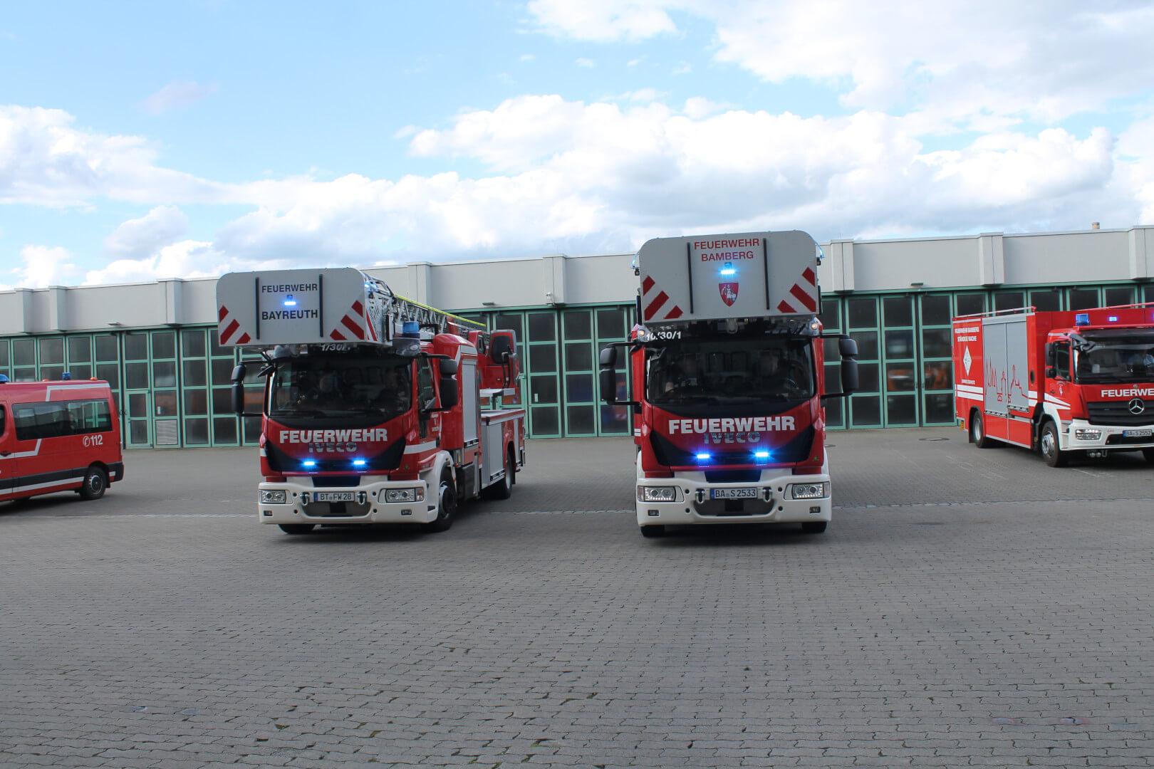 Nachdem Kameraden der Ständigen Wache über zwei Tage im Magirus-Werk in Ulm eine Einweisung erhielten, versammelten sich ca. 80 Kameradinnen und Kameraden im Innenhof der Ständigen Wache um das neue Fahrzeug gebührend in Empfang zu nehmen. Nun war es endlich soweit: „Der Fuhrpark der Feuerwehr Bamberg kann mit diesem modernen und schlagkräftigen Hubrettungsfahrzeug wieder auf den erforderlichen Bedarf gehoben werden“, präsentierte Stadtbrandrat Florian Kaiser die neue Drehleiter nach Ankunft beim Empfang auf der Ständigen Wache. Dadurch, dass es sich um eine interkommunale Beschaffung mit der Stadt Bayreuth handelt, kehrten deren Kameraden mit ihrer neuen, baugleichen Drehleiter kurzweg mit in Bamberg ein und nutzen diese Gelegenheit für eine kurze Lenkpause.