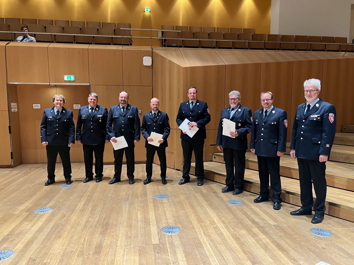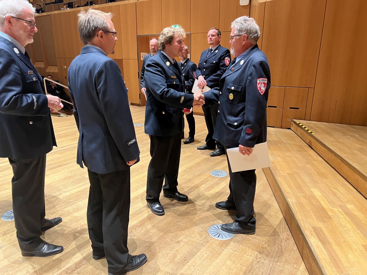 Neben Ehrungen für 25 und 40 Jahre aktive Dienstzeit konnten auch langjährige Vereinsmitglieder ausgezeichnet werden. Den aufgrund der Altersgrenze aus dem aktiven Dienst scheidenden Kameraden Geßner (LG 7), Graf (LG 9), Holzschuh (LG 8), Kropf (LG 5/6) und Reitzentein (LG 8) gebührt besonderer Dank für ihr Engagement für die Sicherheit in unserer Stadt.