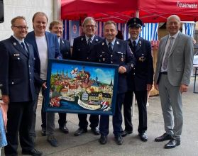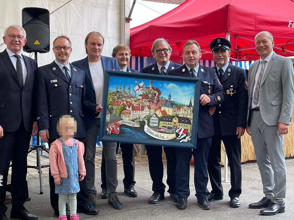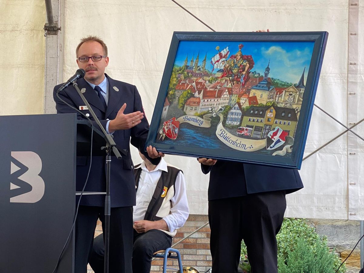 Herr Bürgermeister Karmann durfte auch zahlreiche Vertreter der Politik wie Herrn Landrat Johann Kalb, Herrn Landtagsabgeordneten Holger Dremel sowie die beiden Bundestagsabgeordneten Herrn Andreas Schwarz und Herrn Thomas Silberhorn begrüßen. Den besonderen Rahmen nutzend, übergab die Freiwillige Feuerwehr Bamberg das von aus den eigenen Reihen stammenden Kamerad Peter Maierhofer bereits im Frühjahr 2020 gefertigte Gemälde „Patenfeuerwehren Buttenheim und Bamberg – 150 Jahre Feuerwehr Buttenheim“. Dieses wollte man eigentlich anlässlich des Gründungsjubiläums übergeben. Das Fest zum Jubiläum unserer Patenwehr fiel 2020 leider aufgrund der Pandemie aus.