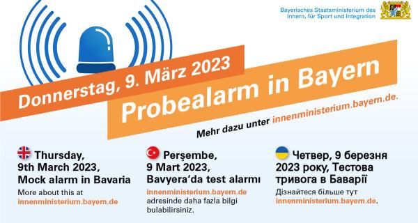 Am Donnerstag, 9. März 2023, gibt es einen bayernweit einheitlichen Probealarm. Vorbereitet wird er vom Bayerischen Staatsministerium des Innern, für Sport und Integration in Abstimmung mit dem Bundesamt für Bevölkerungsschutz und Katastrophenhilfe (BBK). Dabei werden vor allem die digitalen Warnmöglichkeiten genutzt, nämlich die Alarmierung über Apps wie NINA, KATWARN oder BIWAPP oder mit Hilfe der neuen Technik Cell Broadcast. Um 11 Uhr werden die Meldungen ausgespielt, gegen 11.20 Uhr erfolgt die Entwarnung.