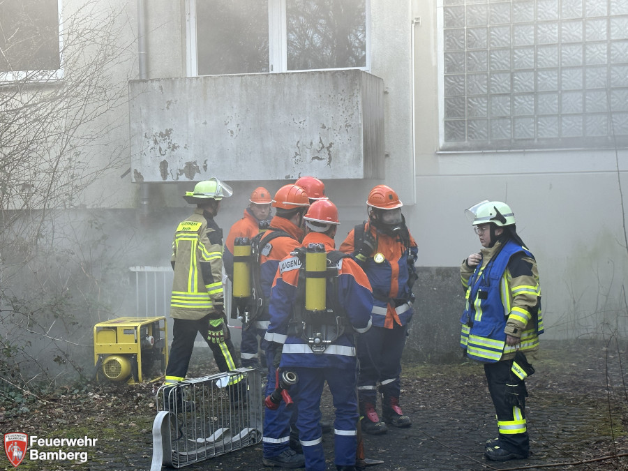 Vor Ort zeigte sich jedoch ein anderes Meldebild: Zwar war eine Türe versperrt, jedoch drang dichter Rauch aus dem Gebäude. Eine Vollalarmierung der Jugendfeuerwehren Bamberg und Reuth folgte.