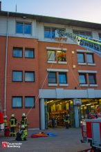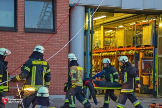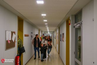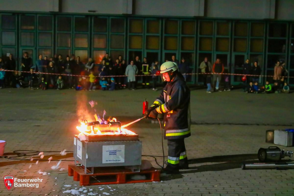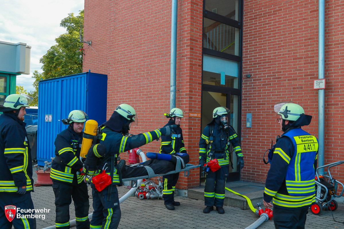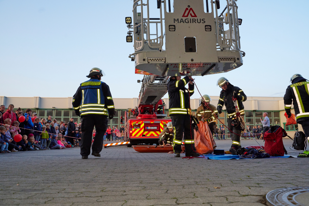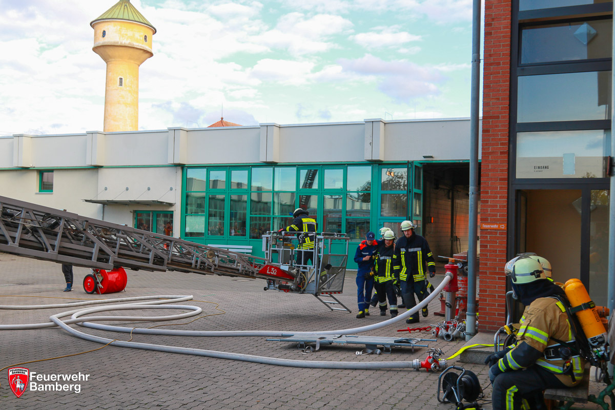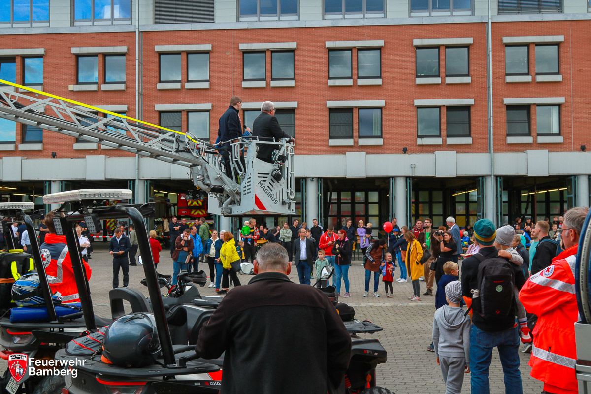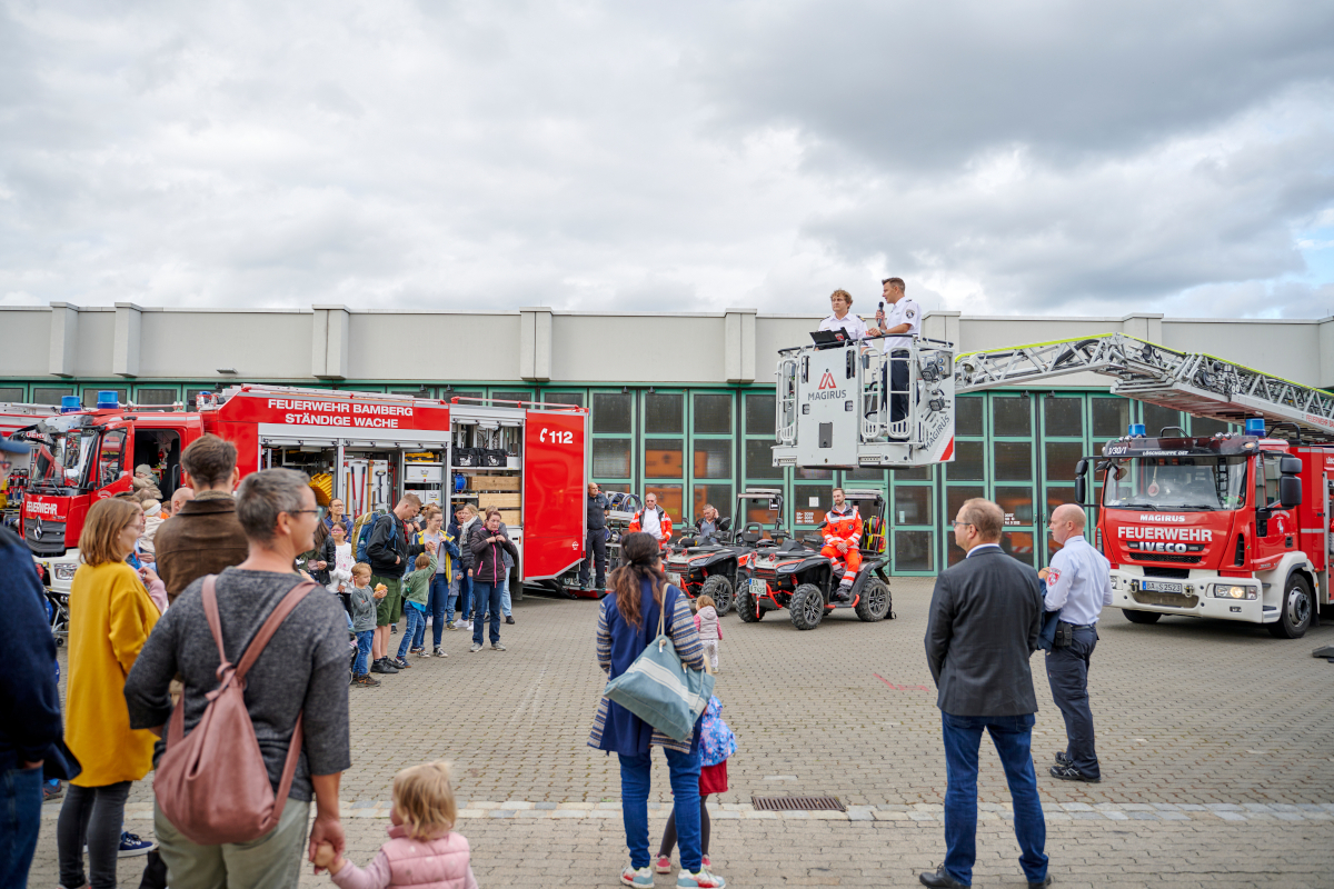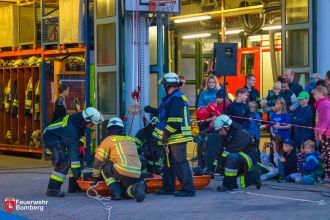 Um den Interessierten auch Einblicke in den Hauptberuf der Feuerwehrfrau/dem Feuerwehrmann zu gewähren, boten die Beamten der Ständigen Wache zu jeder halben Stunde eine Führung durch das Dienstgebäude Margaretendamm an. Zu jeder vollen Stunde hieß es „Einsatz für die Feuerwehr Bamberg!“. Unter der Moderation von Mit-Organisator Oliver Eßel startete die erste Darstellung. Ein für das Aufgabengebiet der Feuerwehr typischer Einsatz: Zimmerbrand mit Personen in Gefahr. Die Kameradinnen und Kameraden rückten an und zeigten ihr Können zur Menschenrettung über die Drehleiter und der Brandbekämpfung unter schwerem Atemschutz.