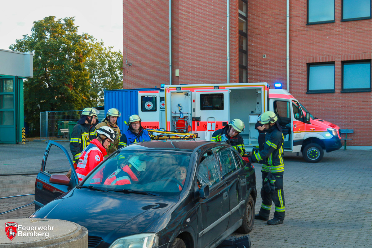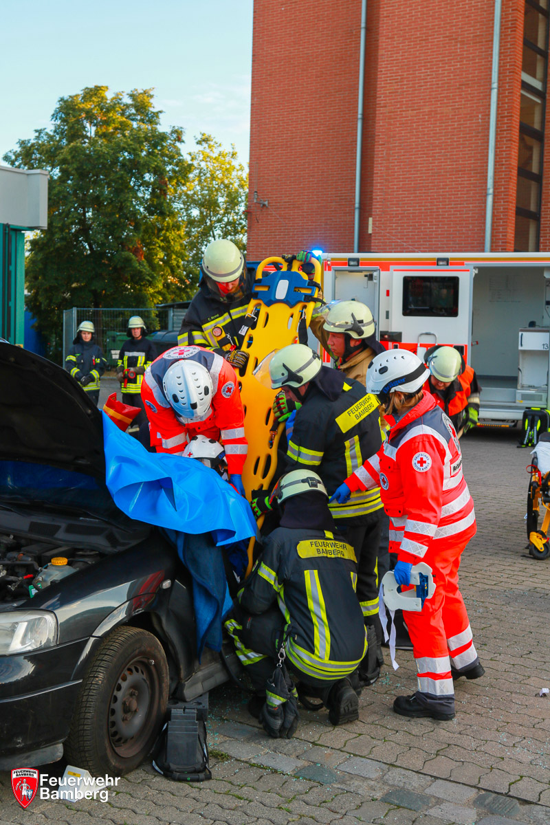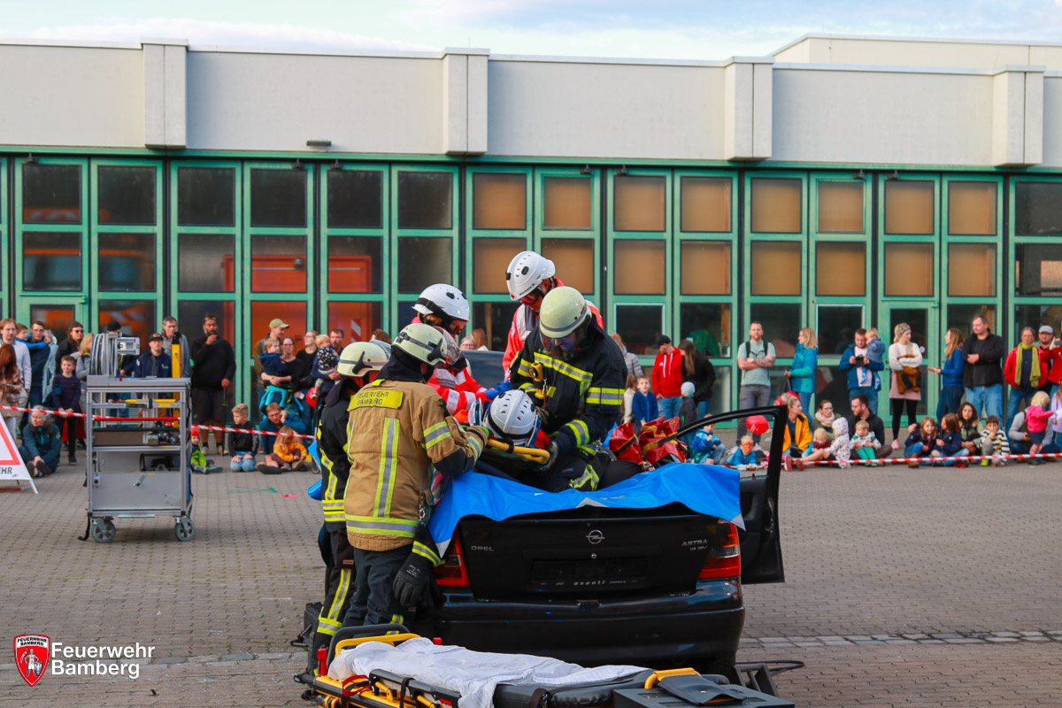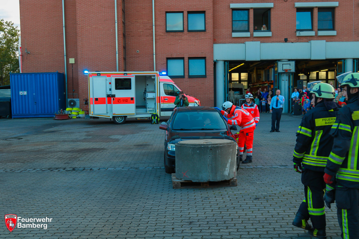 Zur nächsten vollen Stunde wurde ein Verkehrsunfallszenario mit einer eingeklemmten Person in Zusammenarbeit mit dem Bamberger BRK gezeigt. Neben den Tätigkeiten der Feuerwehr zeigte sich hier die reibungslose Zusammenarbeit zwischen Feuerwehr und Rettungsdienst. Eine gegenseitige Koordination der beiden Organisationen, ein sicheres Bedienen der schweren Gerätschaften und die Fertigkeiten der Einsatzkräfte, führten letztlich zur Befreiung und Versorgung der verunfallten Person.
