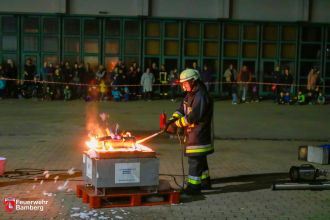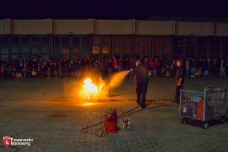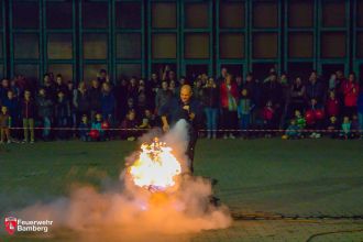 Mit Einbruch der Dunkelheit wurde es feurig. Wie funktioniert ein Feuerlöscher? Was ist der Unterschied zwischen einem Wasser- und CO2-Löscher? Eindrucksvoll demonstrierten zwei Kameraden die richtige Vorgehensweise der unterschiedlichen Fabrikate bei echten Flammen. Für große Augen sorgte die vorgeführte Fettexplosion, welche die Folge von Wassereinsatz bei einem Fettbrand sein kann. Diese erhellte kurzerhand die Übungsfläche. „Schaumparty!“ hieß es im Anschluss. Wobei hier weniger die Feierlichkeit im Vordergrund steht. Schaum entzieht einem Feuer den notwendigen Sauerstoff, weshalb es in Folge erstickt. Daher ist es bei gewissen Bränden ein extrem hilfreiches Mittel zur Brandbekämpfung. Auch dies wurde in verschiedenen Varianten eindrucksvoll vorgeführt und präsentiert.