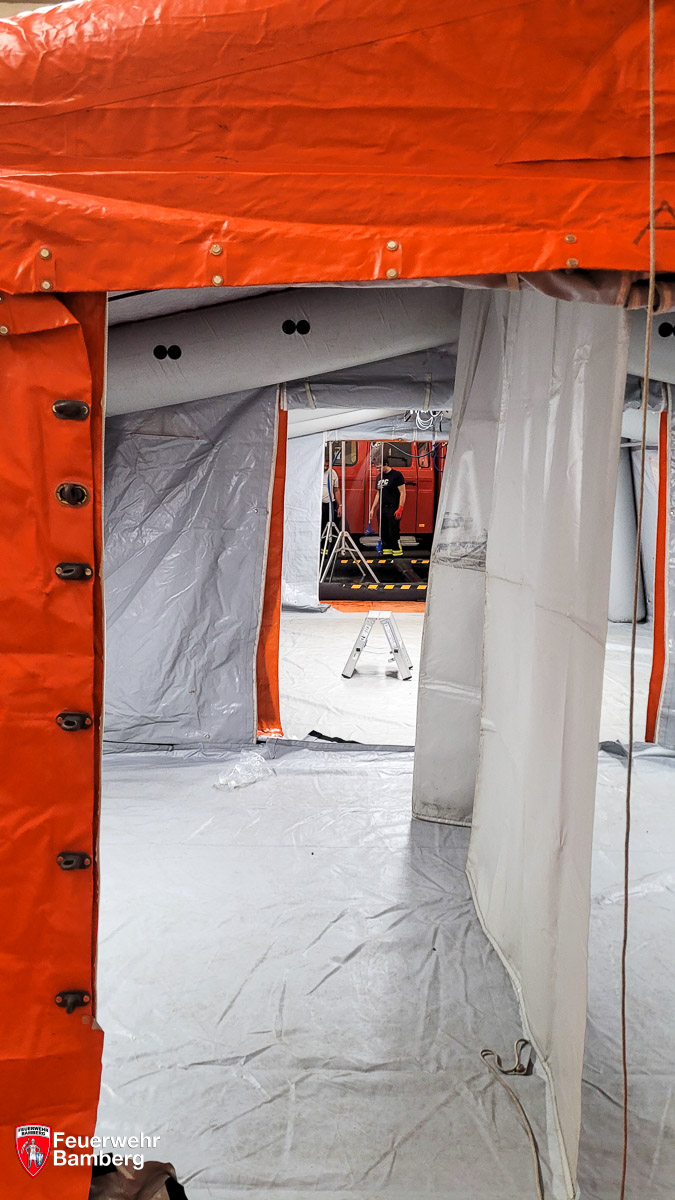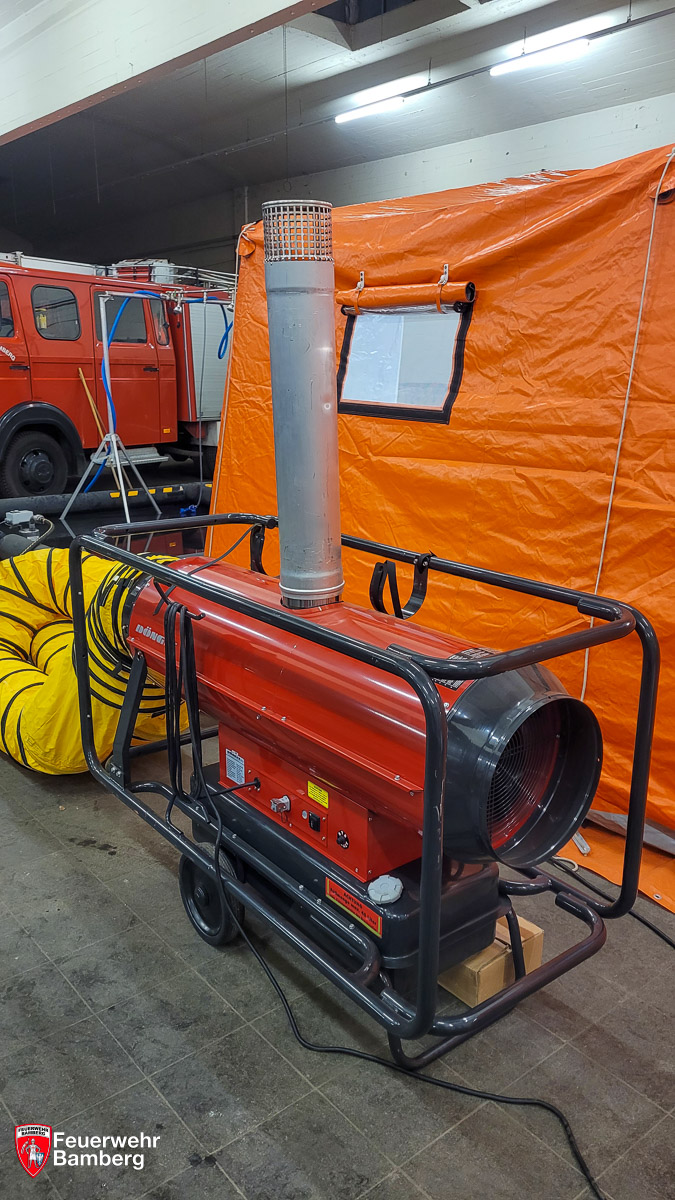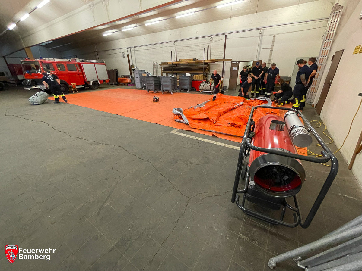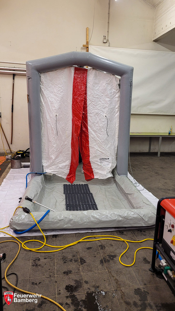 Die Mannschaft für den Aufbau und Betrieb der Ausrüstung wird von den Kameradinnen und Kameraden der ABC-Einheit (Löschgruppe 51) gestellt. Um auch die anderen Löschgruppen der Feuerwehr Bamberg mit dem Gerät vertraut zu machen, wurde am 29.09.2023 der Aufbau und der Betrieb des Dekon-P gemeinsam beübt.
