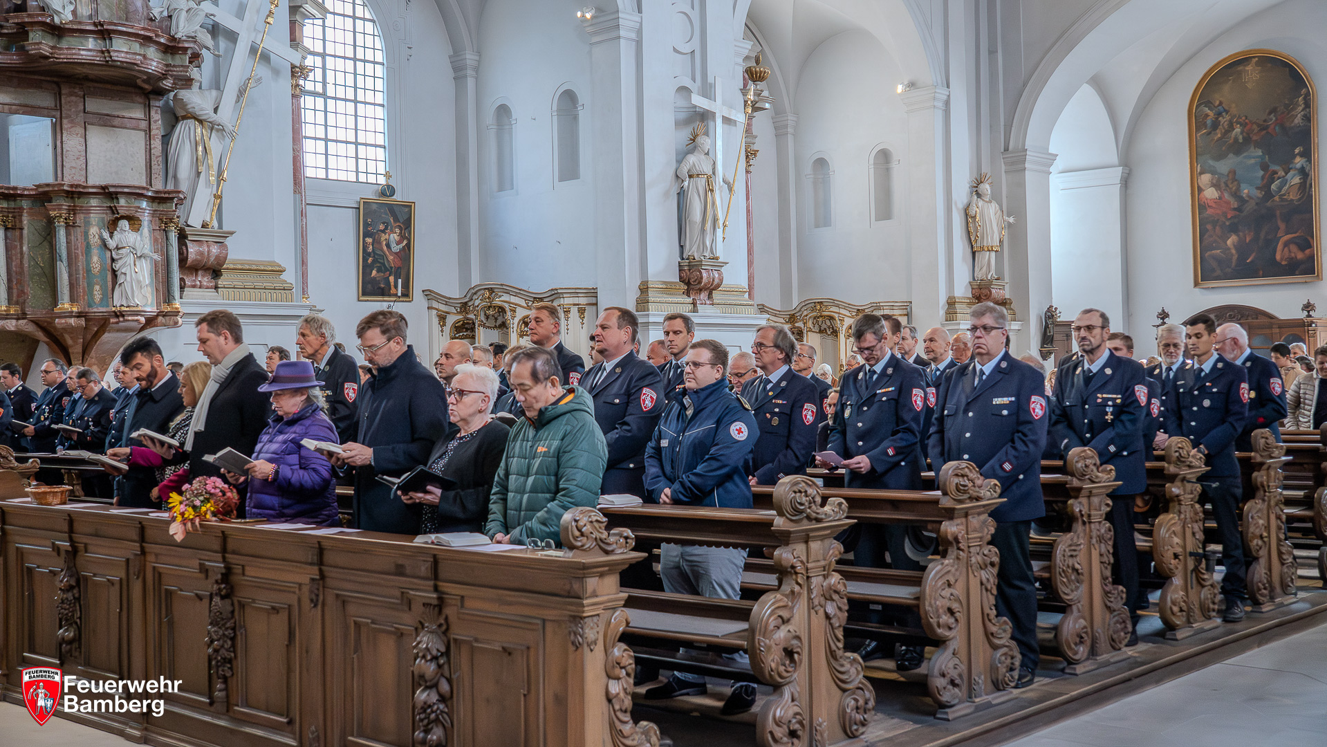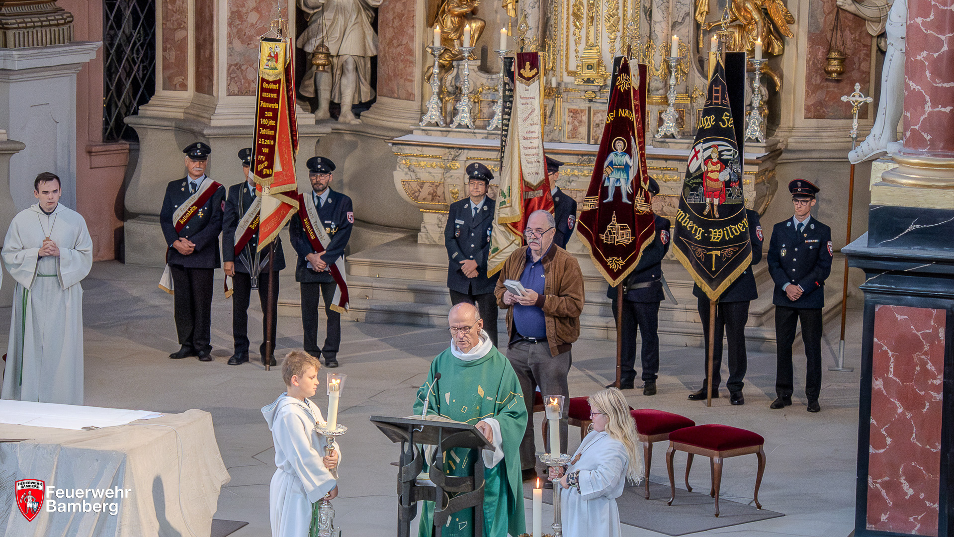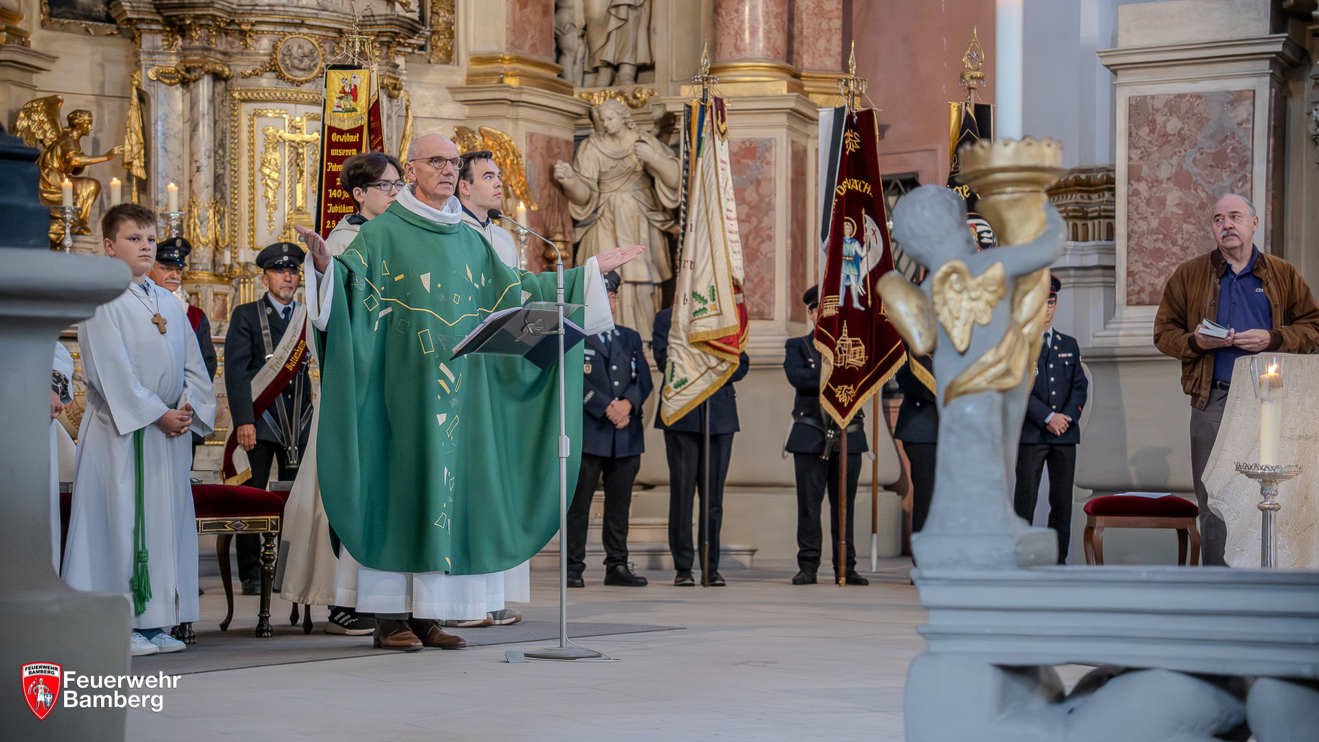 Im Gottesdienst dankte Pfarrer Helmut Hetzel allen Anwesenden – von Bürgermeister Jonas Glüsenkamp sowie weiteren Mitgliedern des Bamberger Stadtrates über Feuerwehrleute bis hin zu den Bürgerinnen und Bürgern – für ihr zahlreiches Kommen. Er hob die Bedeutung der neuen Fahrzeuge für die Sicherheit der Stadt hervor und betonte den Schutz, den die Feuerwehr der Bevölkerung bietet. Symbolisch für die Fahrzeuge stand eine Spielzeug-Drehleiter vor dem Altar. Deren kleiner Besitzer freute sich sehr, dass diese auch den kirchlichen Segen erhalten sollte. Die Szene verdeutlichte die Gemeinschaft der Feuerwehrfamilie mit allen Beteiligten von Jung bis Alt.