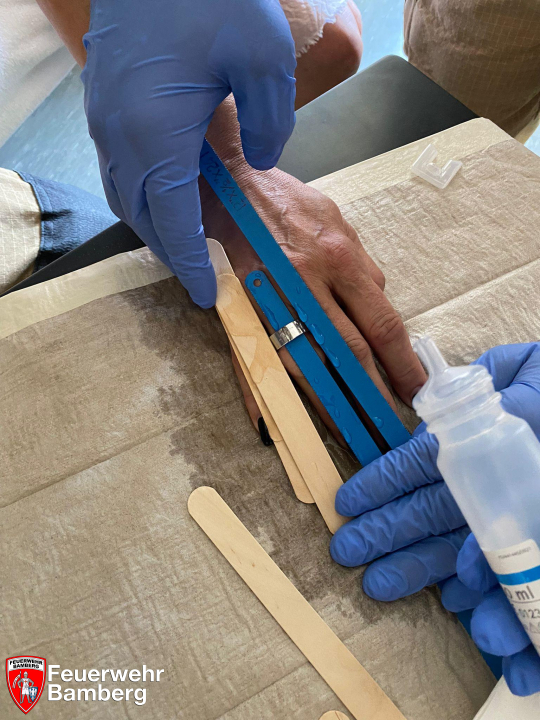 Mittels Akkufräser und Trennscheibe befreite man den Finger vom Ring. Anschließend konnte die Patientin zur weiteren Versorgung in der Praxis verbleiben.