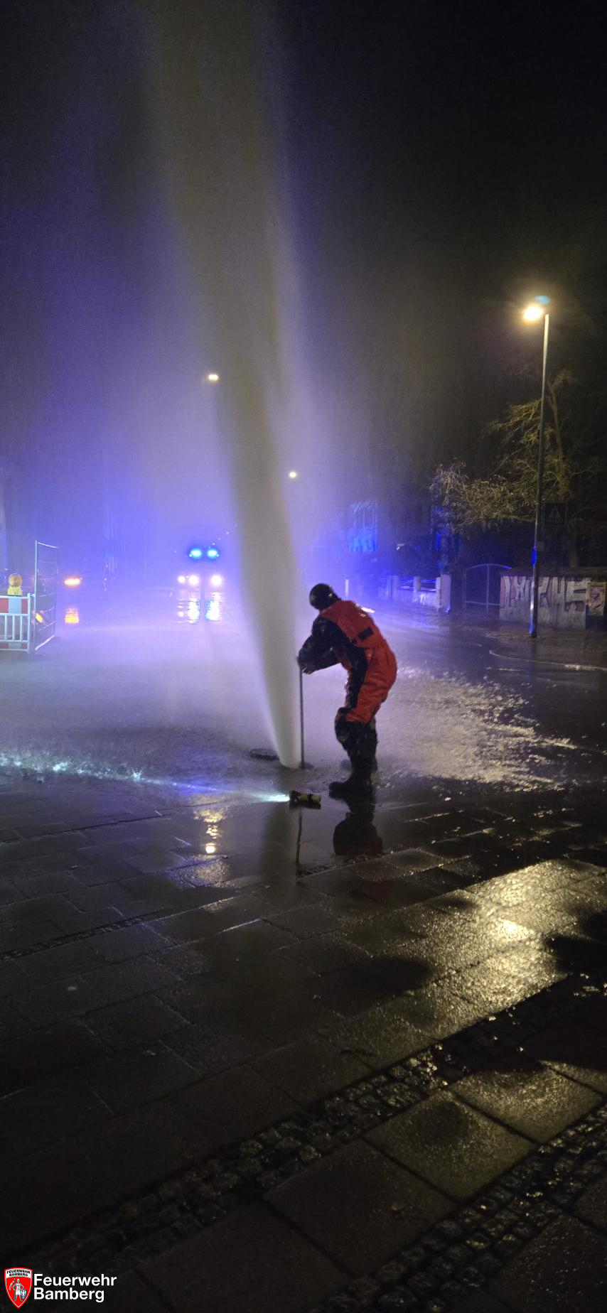 Kurz nach Mitternacht wurde die Feuerwehr Bamberg zur Konzerthalle in der Mußstraße alarmiert. Aufgrund spontanen Nachgebens eines Ventils flog der Deckel eines Unterflurhydranten auf und eine ca. 20 Meter hohe Wasserfontäne schoss heraus. Die Einsatzkräfte sollten versuchen den Hydranten wieder abzustellen, da der Wasserverbrauch immens war und drohte mehr als nur die Straße zu überfluten.