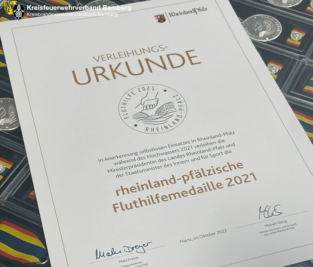 Am 27.09.2023 eröffnete um 18:36 Uhr der feierliche Ehrungsabend in Hallstadt. Im Mittelpunkt stand die Verleihung der Fluthilfemedaille des Bundeslandes Rheinland-Pfalz, die an jene Helfer vergeben wurde, die vom 15.08. bis zum 21.08.2021 während des Hilfeleistungseinsatzes im Ahrtal aktiv waren.