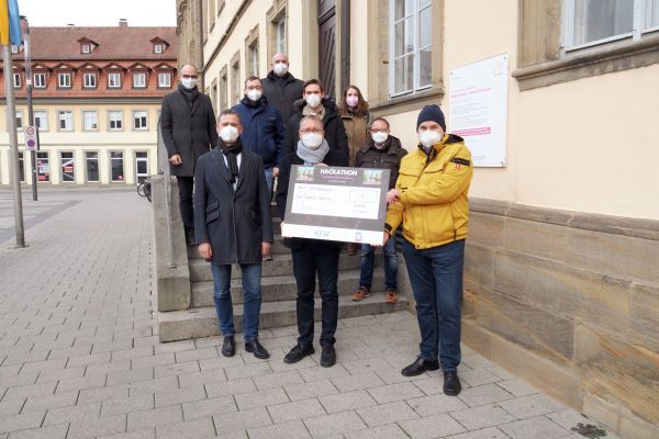 Das Team vom smarten Katastrophenschutz hat den Bamberg-Preis im Wert von 500€ gewonnen. Oberbürgermeister Andreas Starke hat dem Team vor dem Rathaus symbolisch die Geldtafel überreicht.