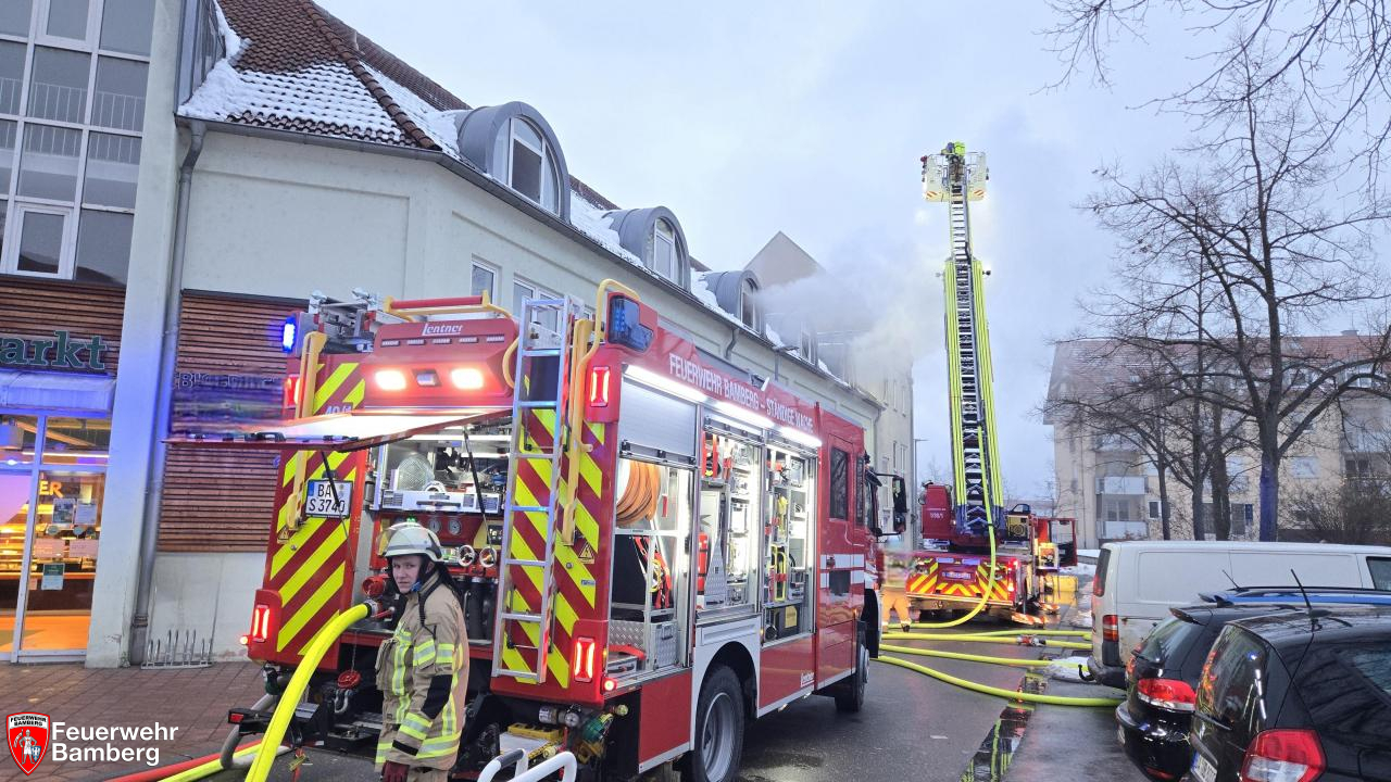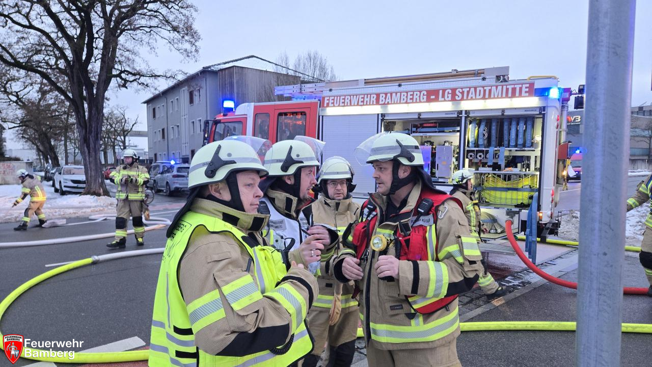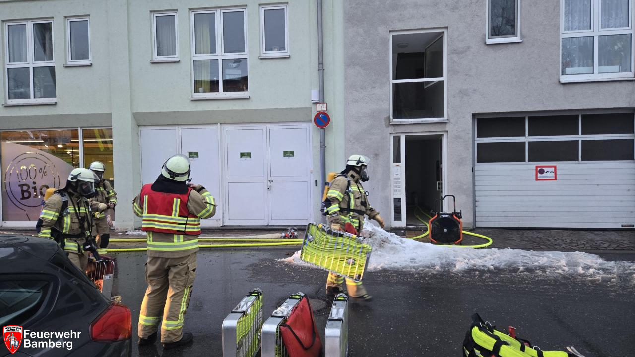 Am Nachmittag wurde die Feuerwehr Bamberg zu einem Zimmerbrand in der Magazinstraße alarmiert. Passanten meldeten oberhalb eines Supermarktes schwarzen Rauch aus einem Fenster. Diese Meldung bestätigte sich bei Eintreffen der ersten Kräfte nach wenigen Minuten. Da zudem Personen an den Fenstern standen und nicht flüchten konnten, wurde die Alarmstufe auf "B3 mit Personen in Gefahr" erhöht.