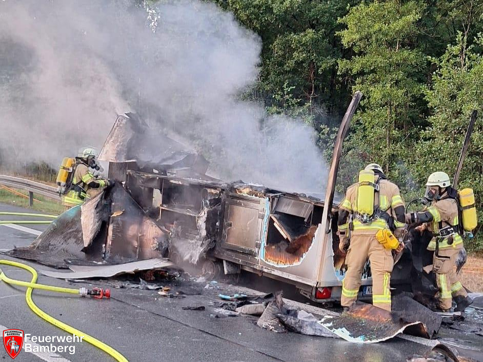 In den Morgenstunden wurde die Feuerwehr Bamberg zu einem Fahrzeugbrand auf die A73 alarmiert. Zwischen den Anschlussstellen Bamberg Süd und Hirschaid geriet ein Grillwagenanhänger in Brand. Geistesgegenwärtig kuppelte der Fahrzeuglenker das Gespann ab.